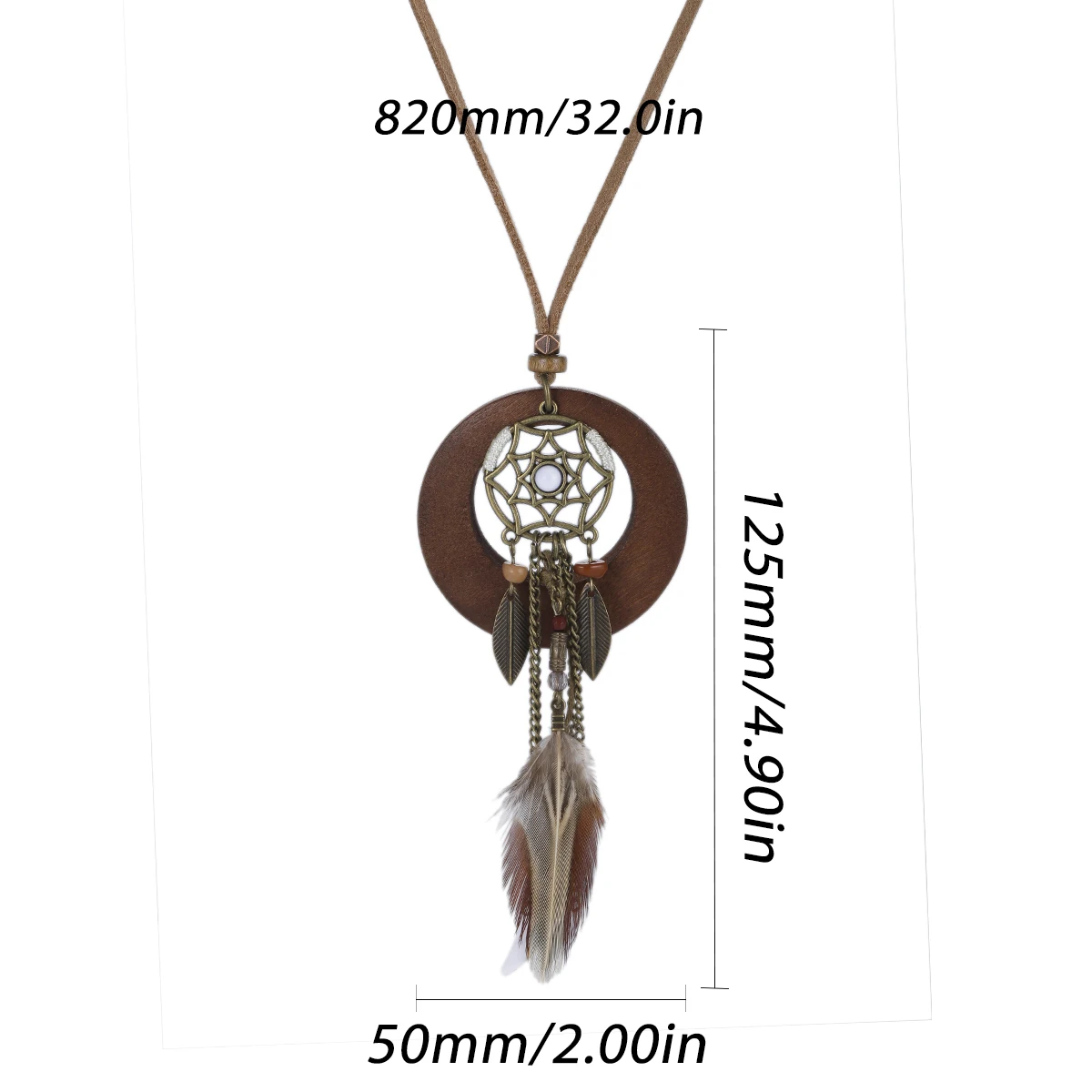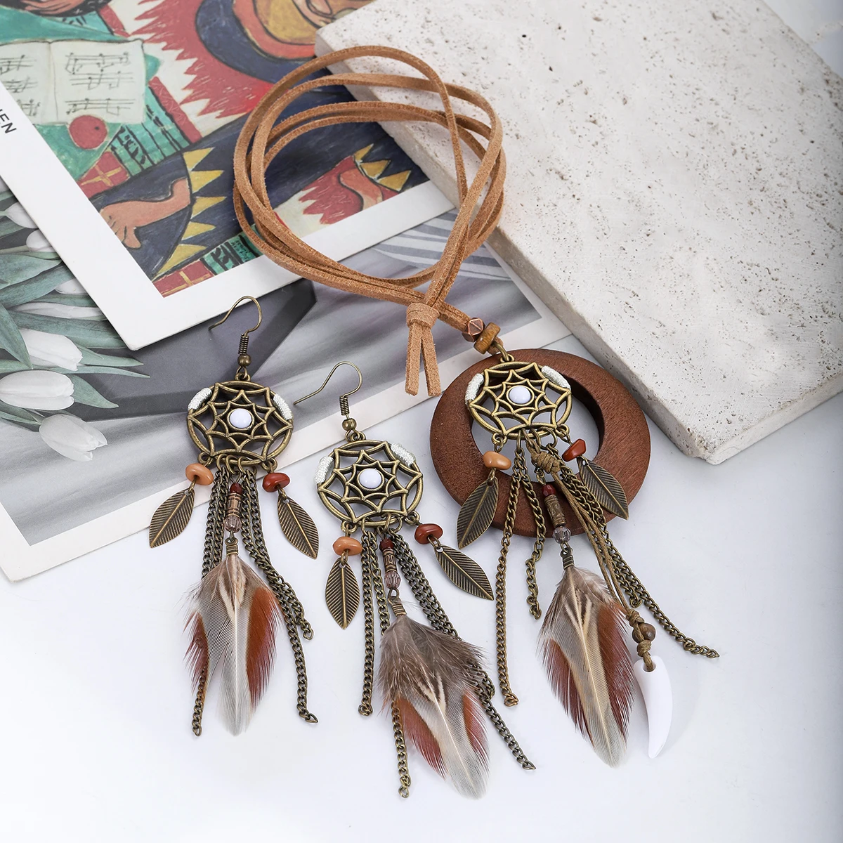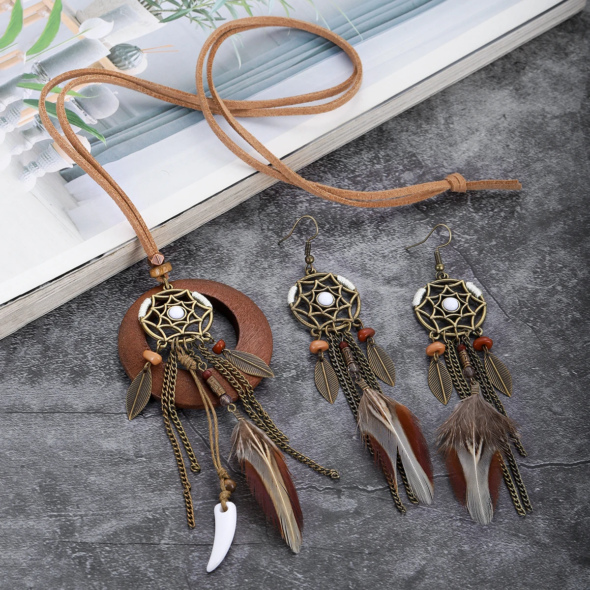 2pcs Bohemia Women's Hollow Dream Catcher Feather Tassel Earrings Sets Retro Alloy Leaf Stone Pendant Earrings Necklace Jewelry