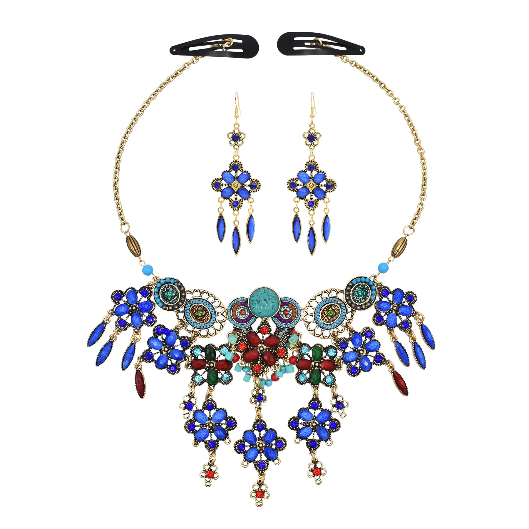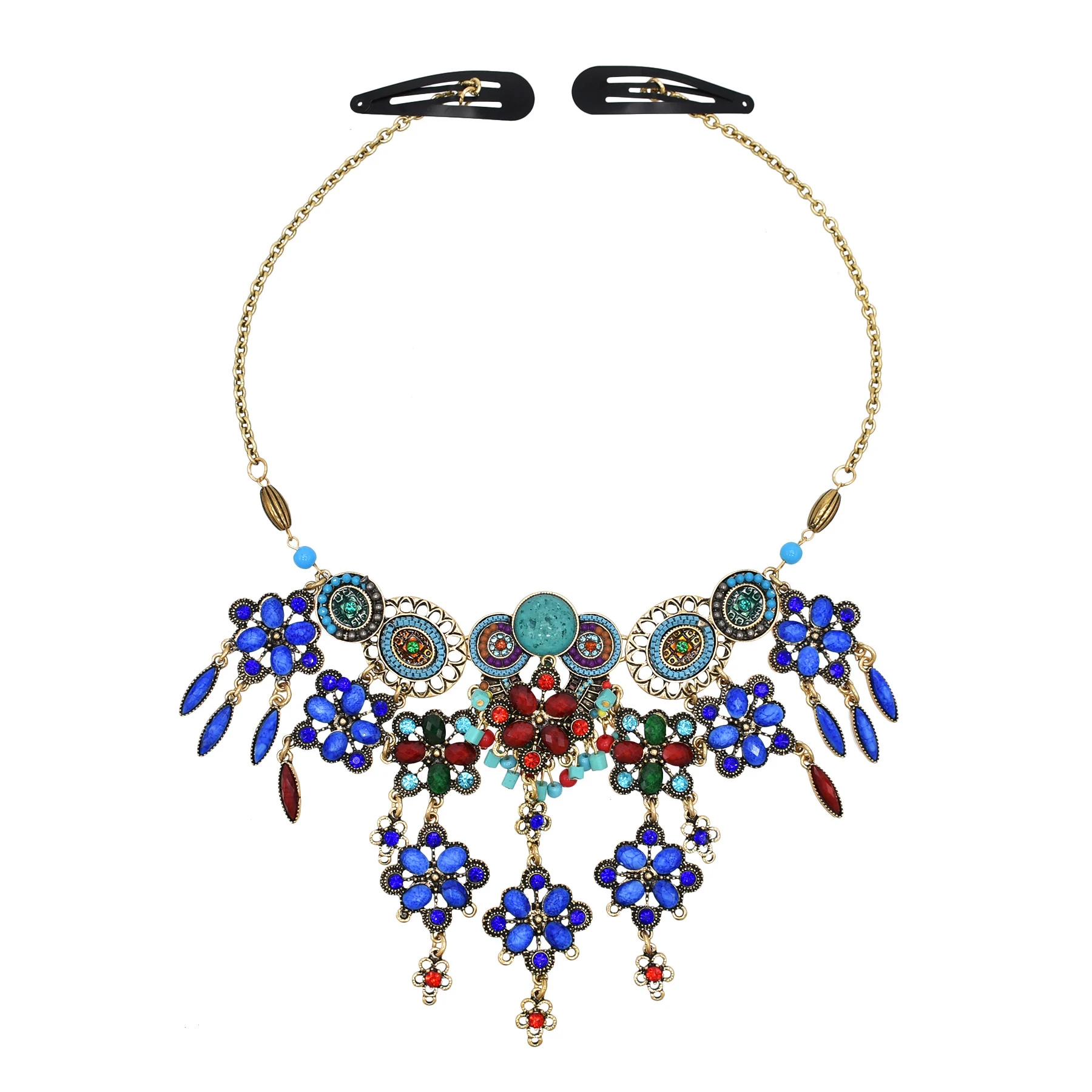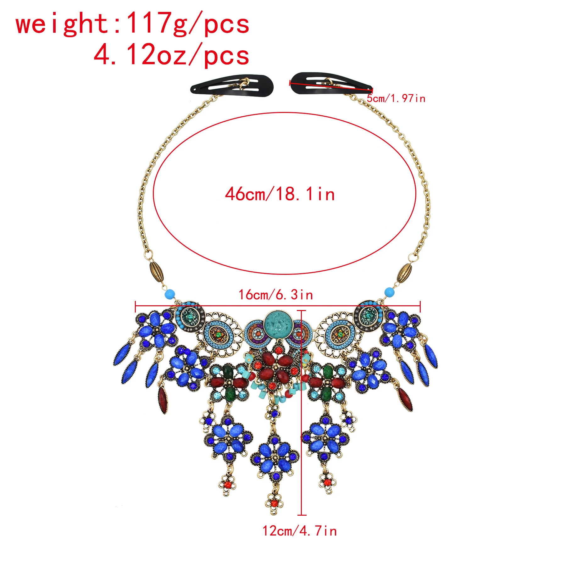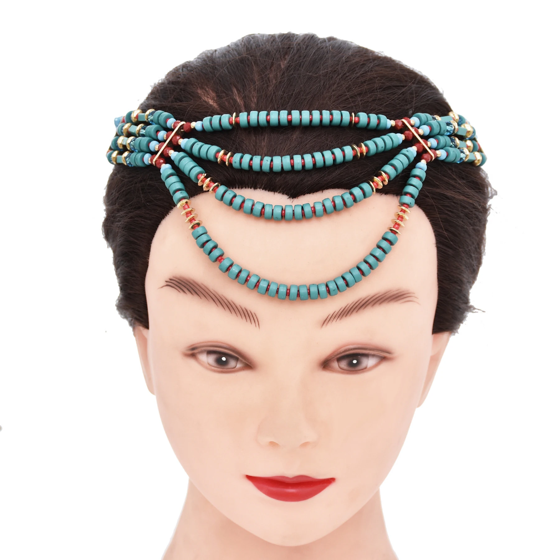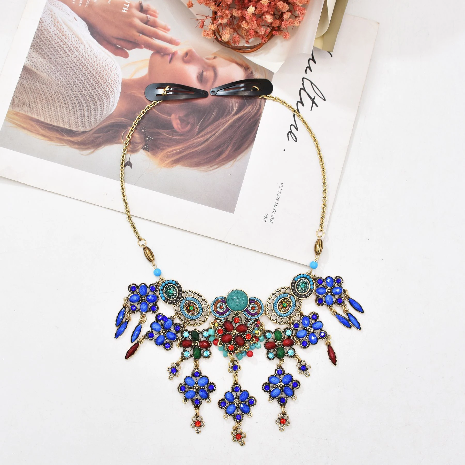 Vintage Turquoise Beaded Crystal Flower Headwear Necklace Earrings Exotic Bohemian Ethnic Bride Wedding Statement Jewelry Set
