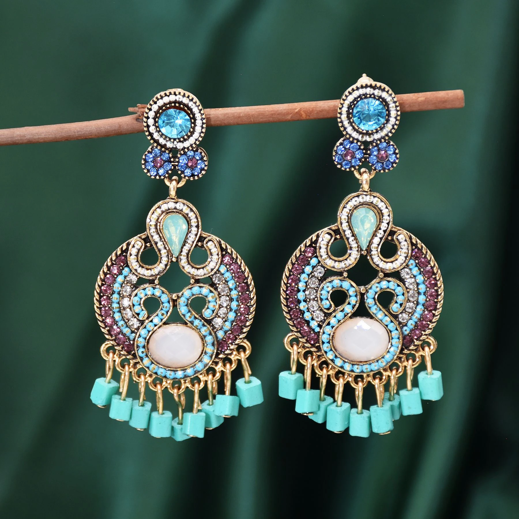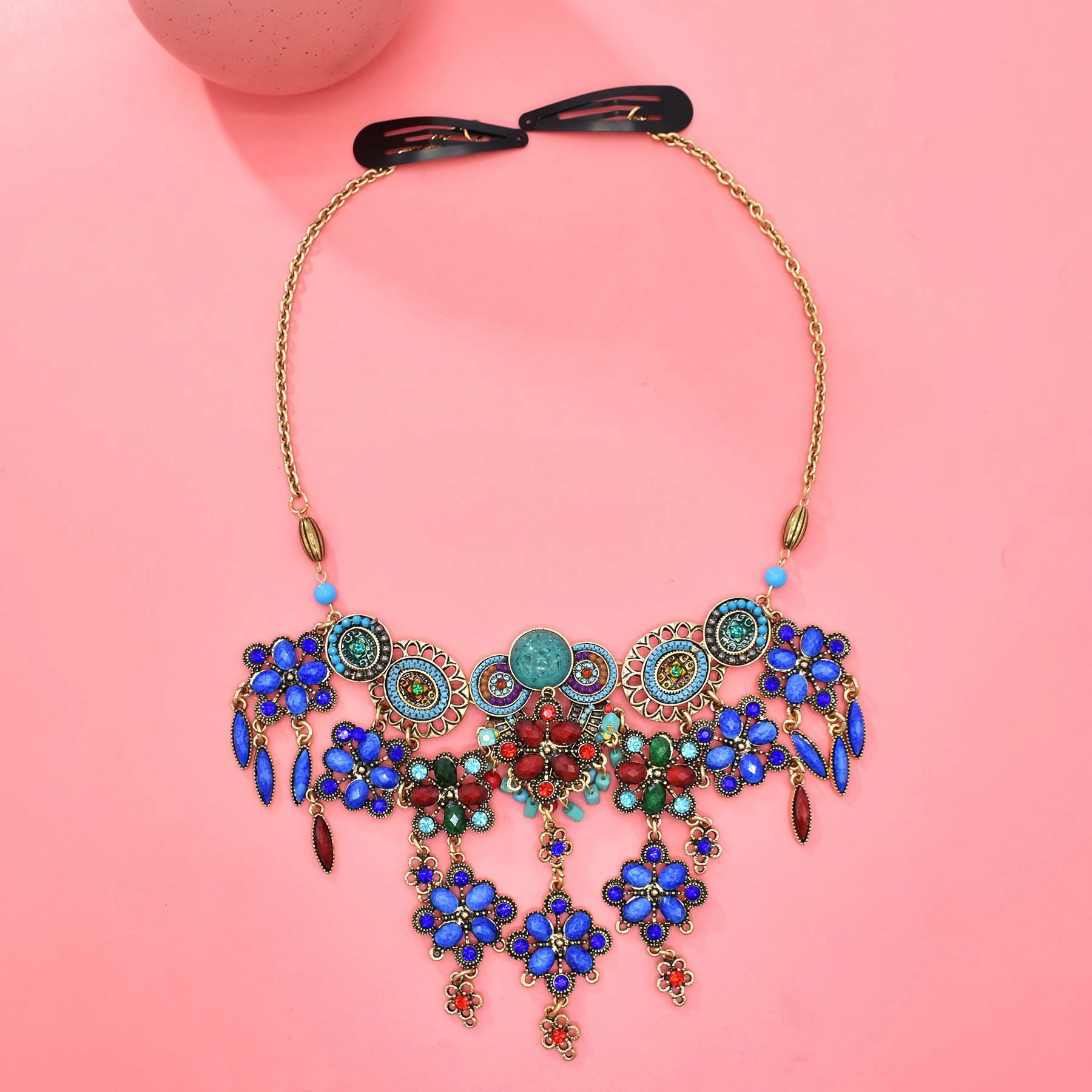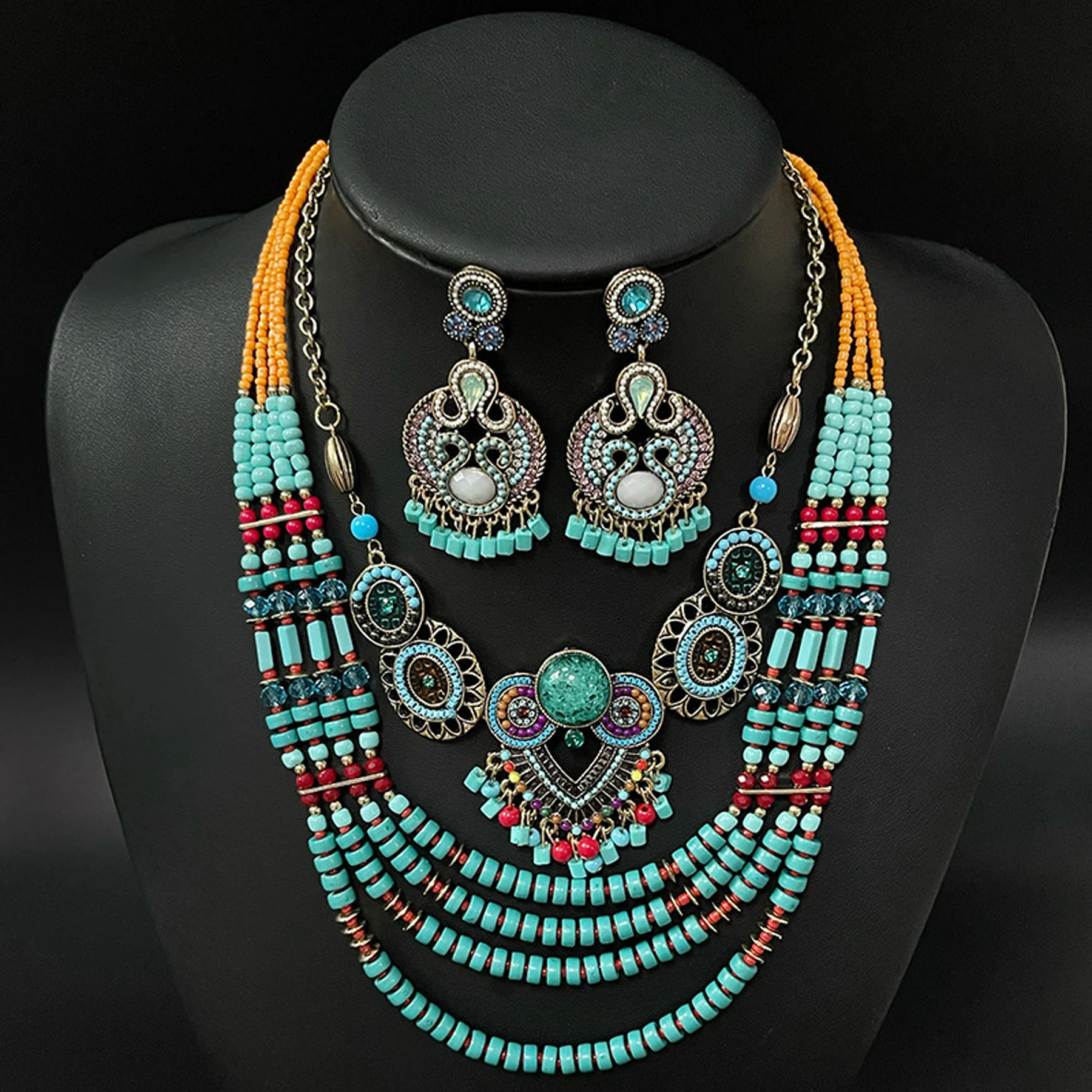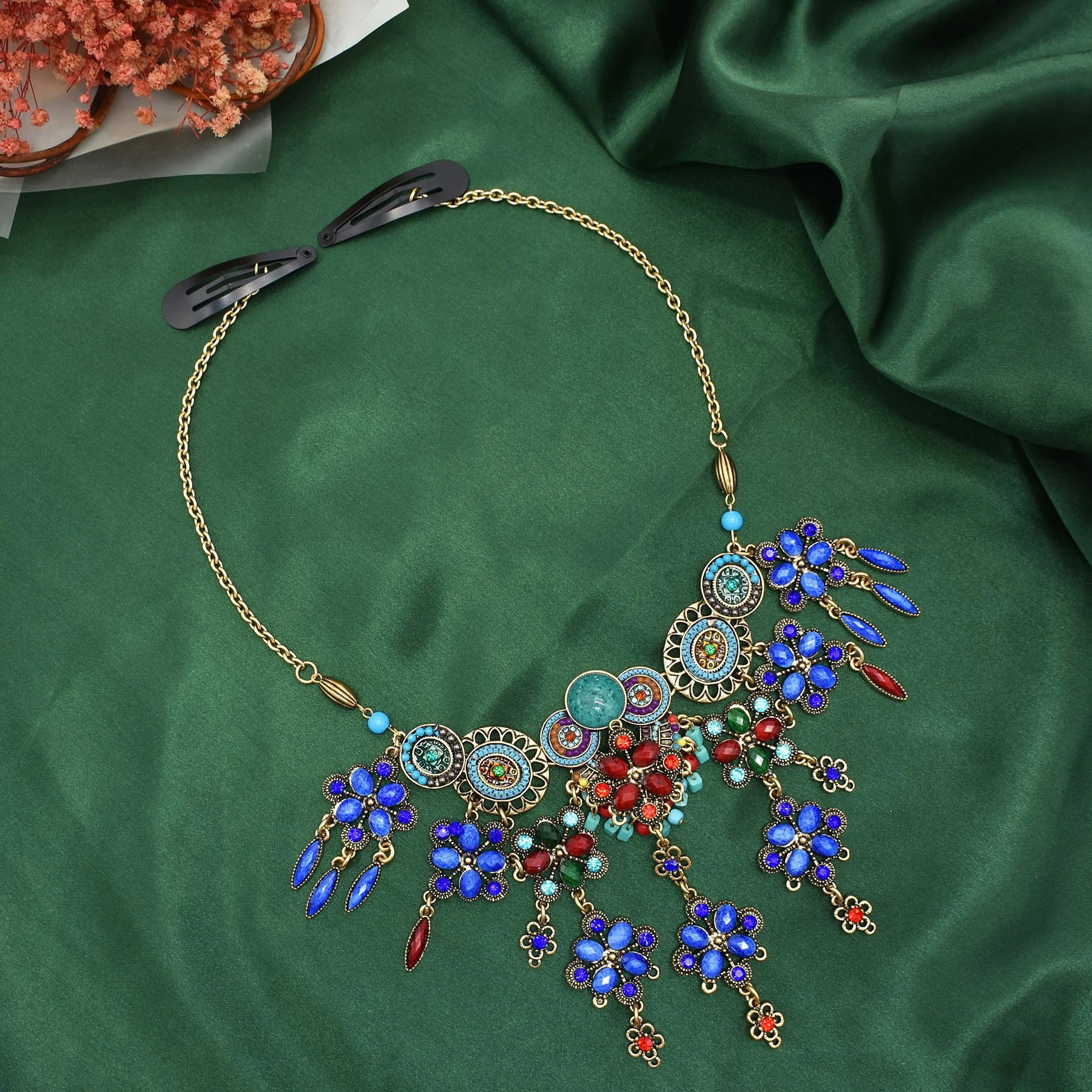 Vintage Turquoise Beaded Crystal Flower Headwear Necklace Earrings Exotic Bohemian Ethnic Bride Wedding Statement Jewelry Set