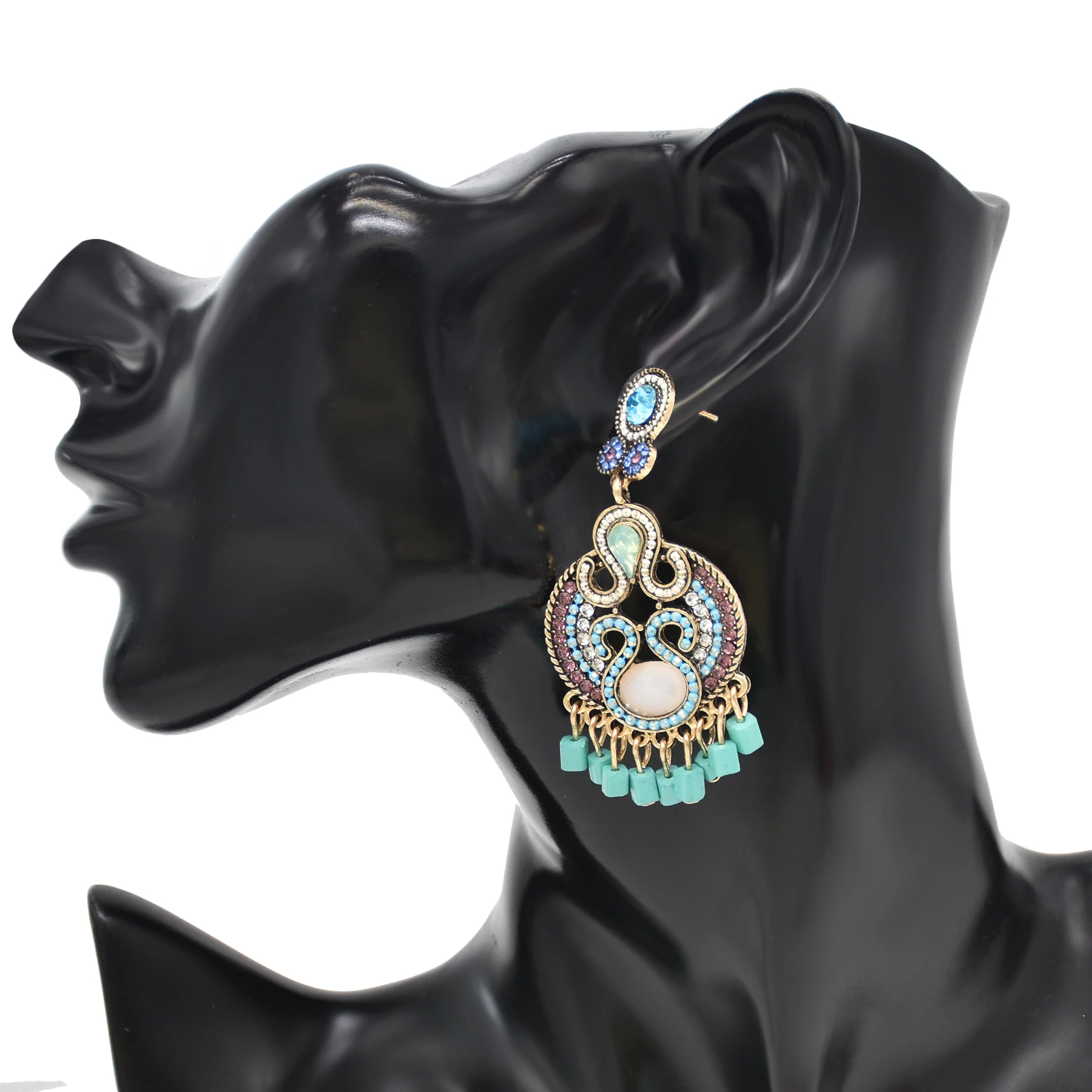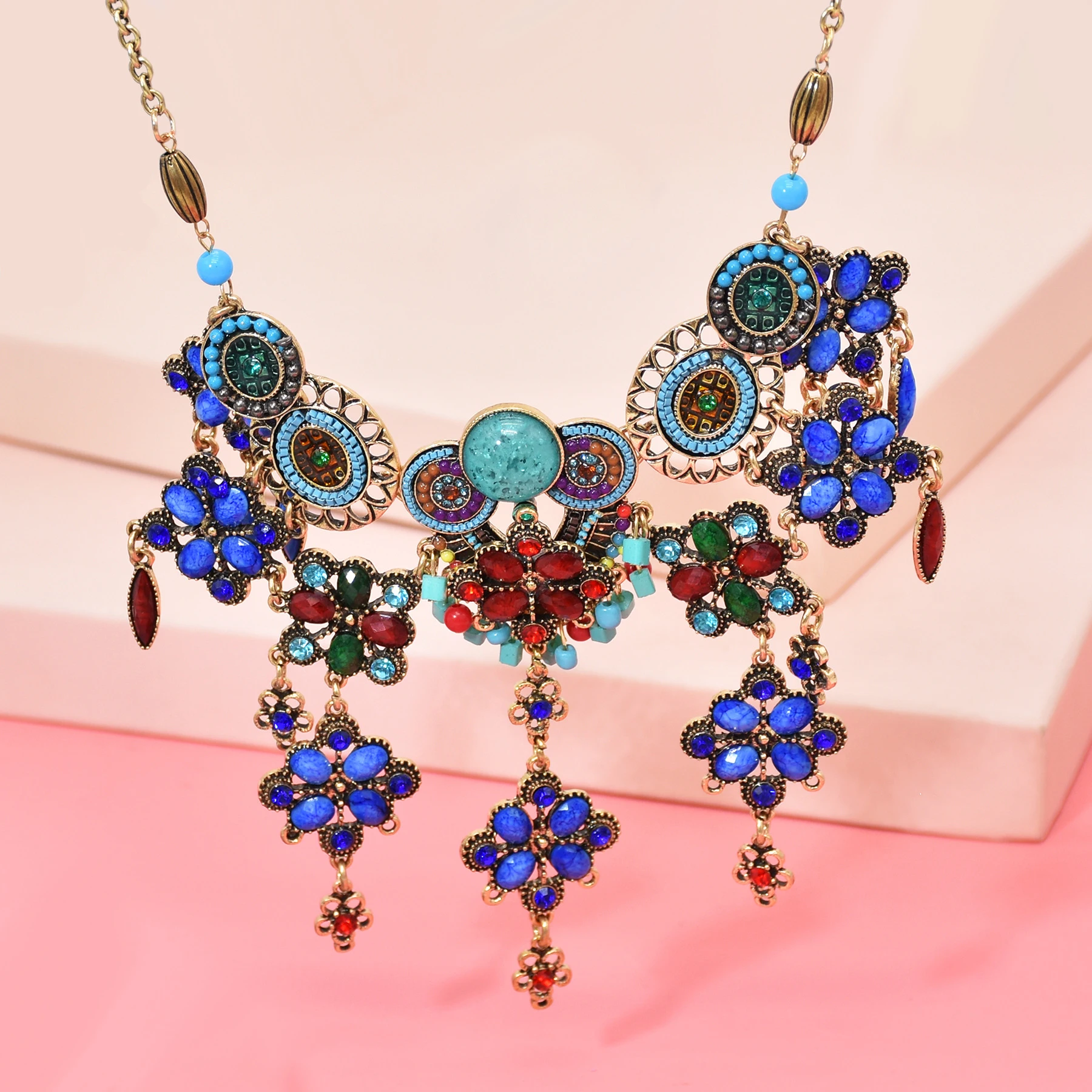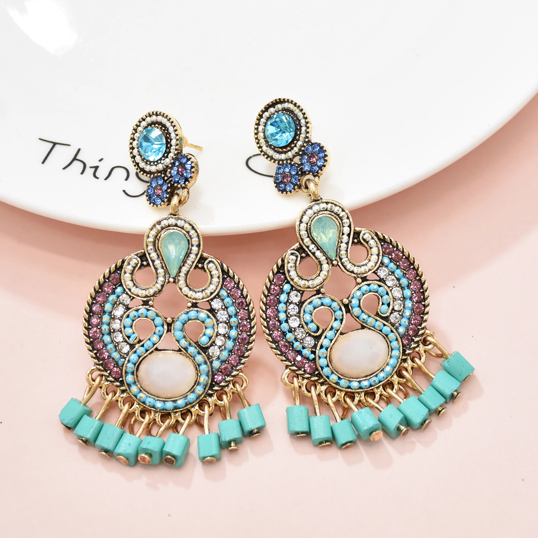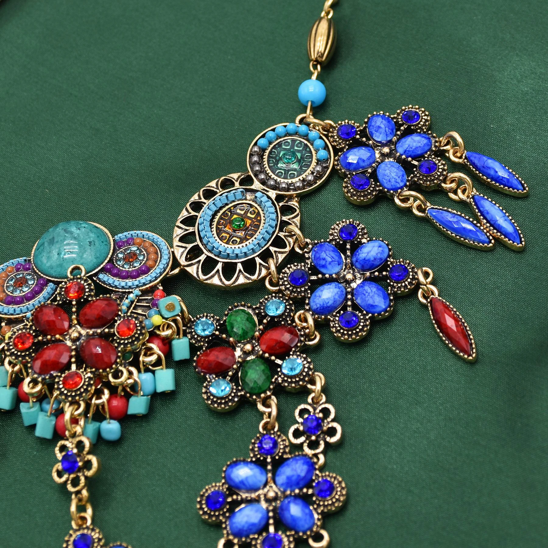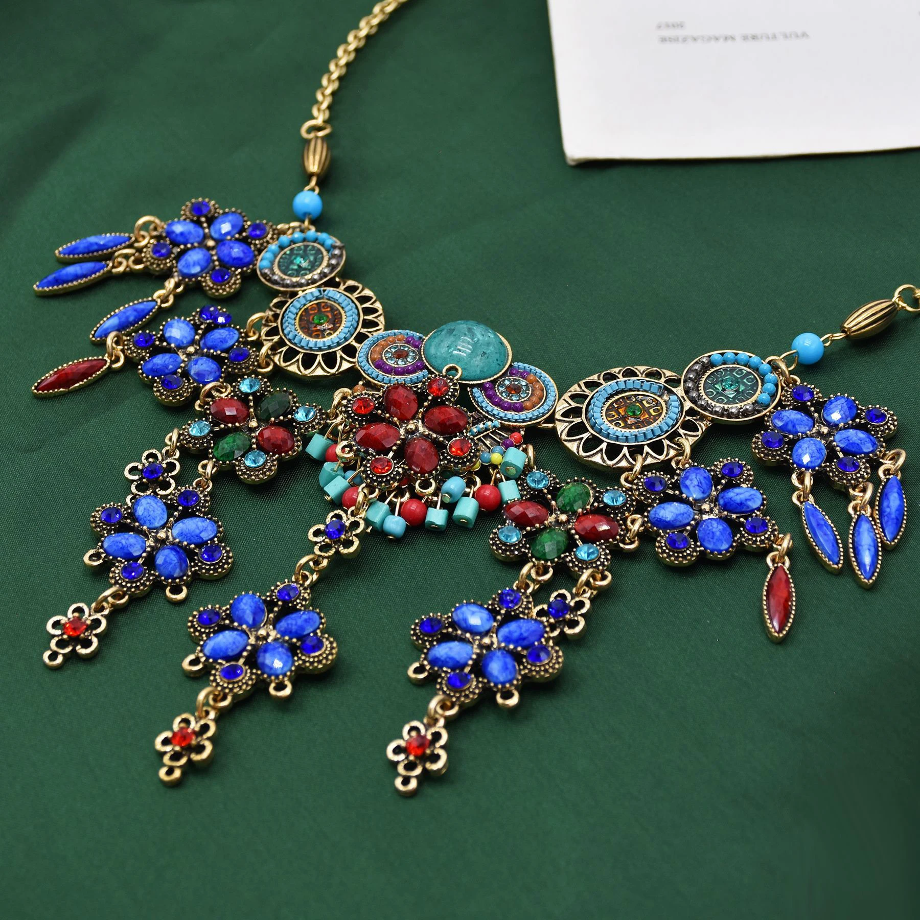 Vintage Turquoise Beaded Crystal Flower Headwear Necklace Earrings Exotic Bohemian Ethnic Bride Wedding Statement Jewelry Set