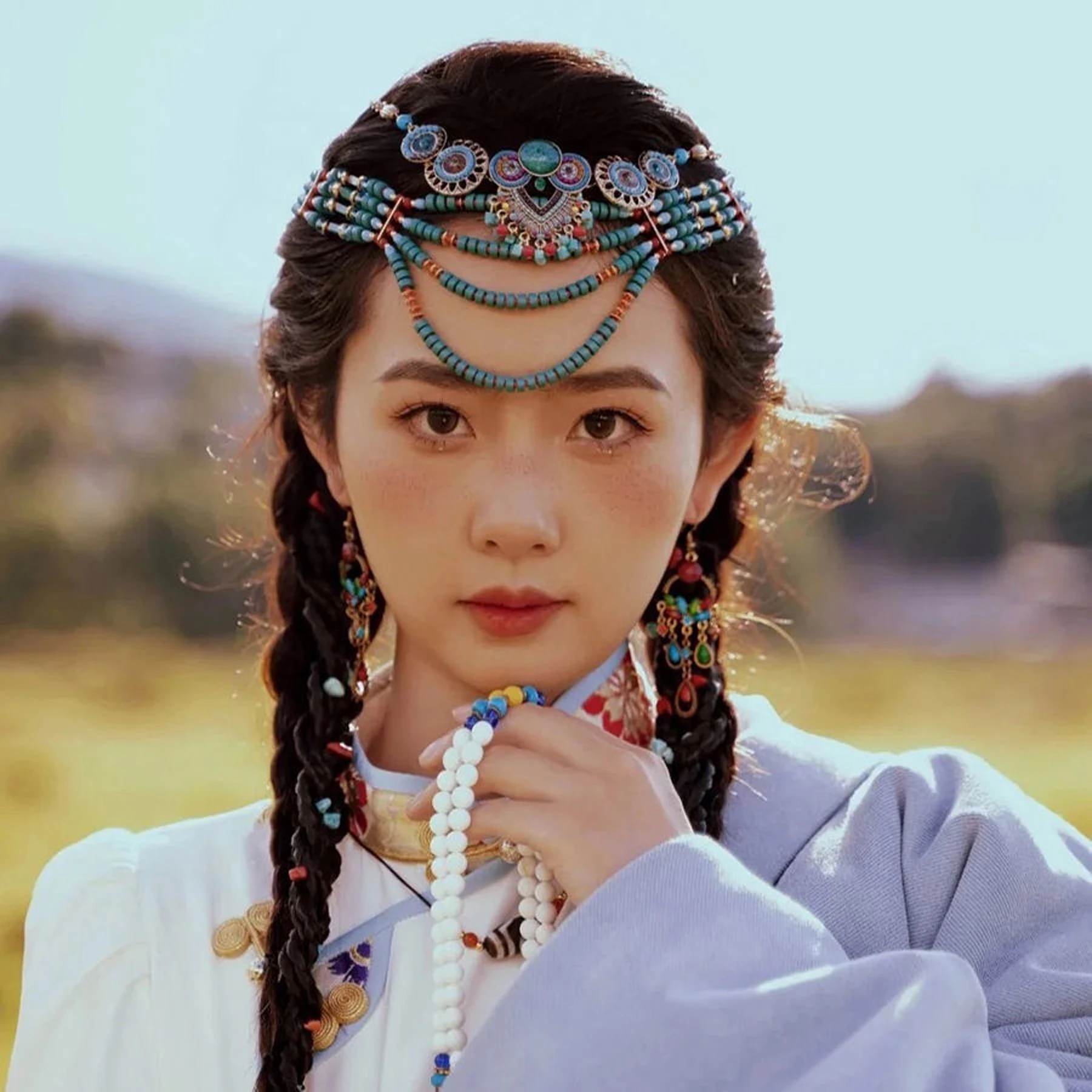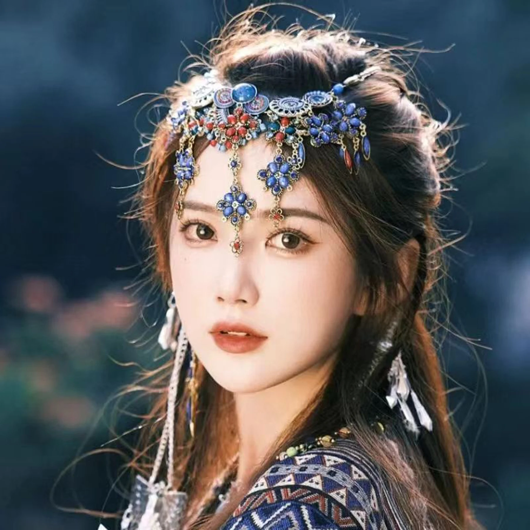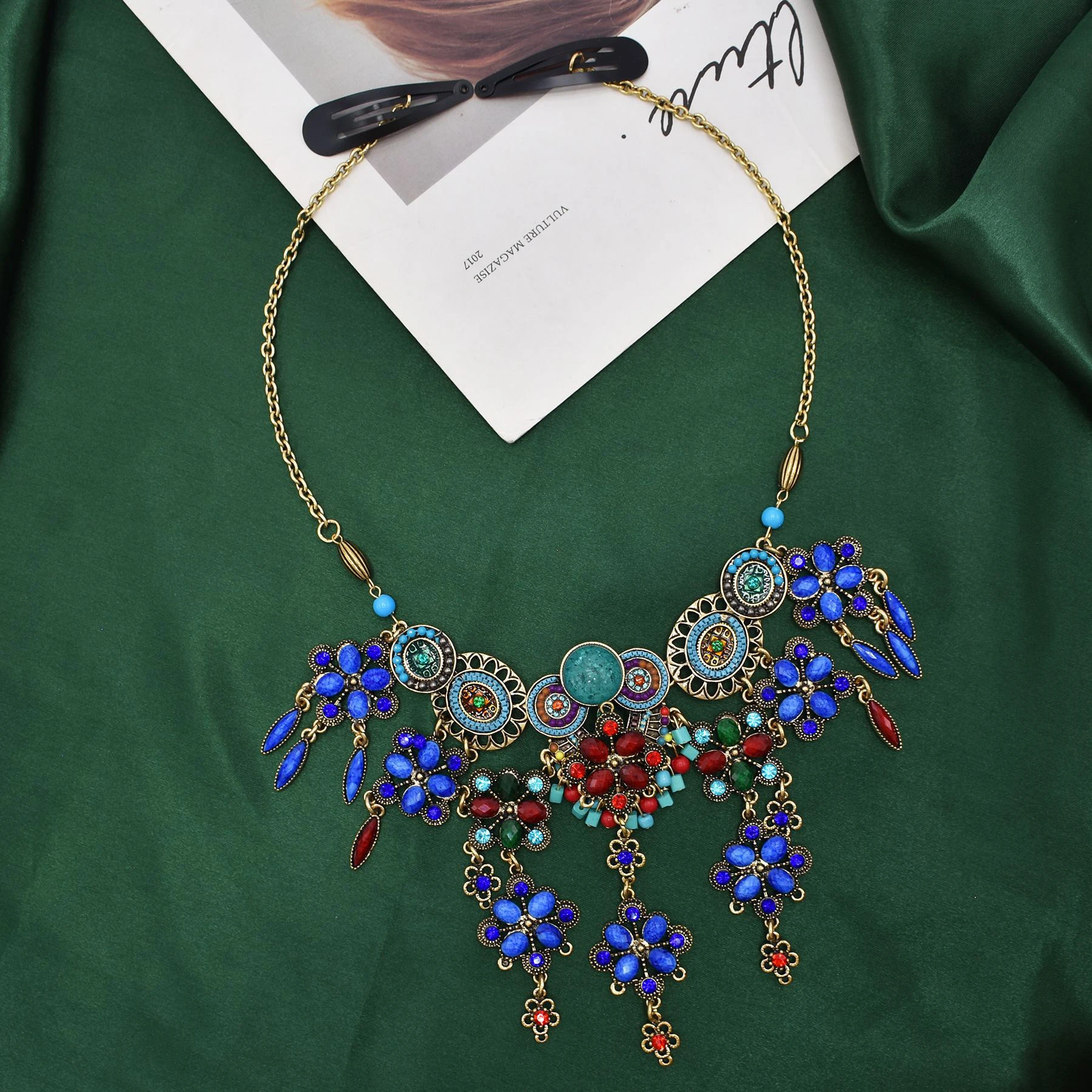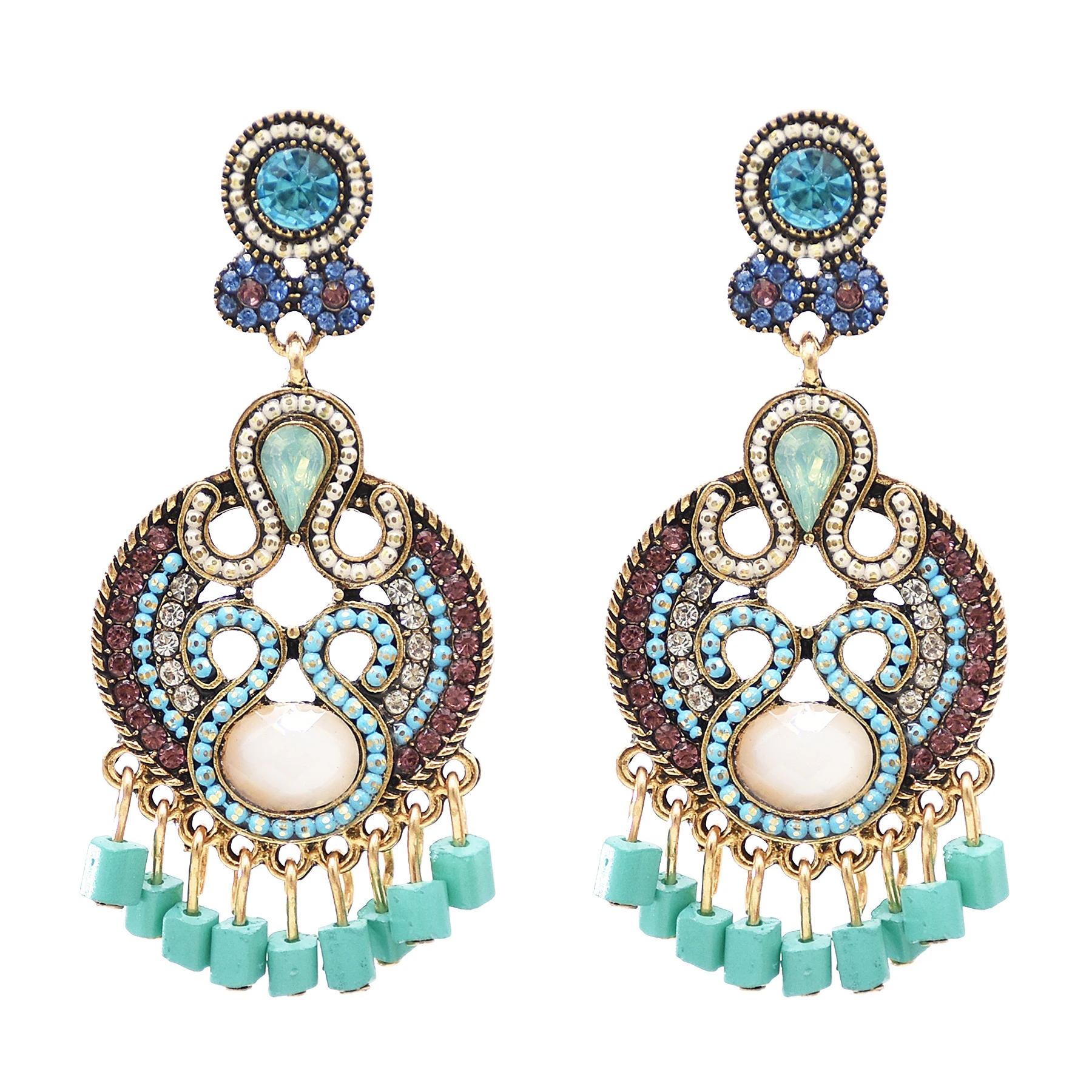 Vintage Turquoise Beaded Crystal Flower Headwear Necklace Earrings Exotic Bohemian Ethnic Bride Wedding Statement Jewelry Set